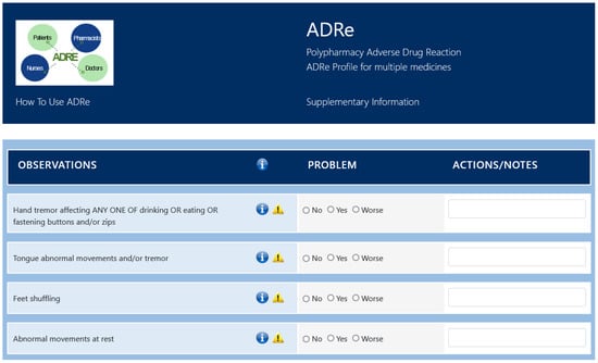 All participants will receive usual standard care, delivered by their health care team. In addition to usual care, the ADRe Profile [3,28,47] will be implemented for the intervention arm participants (see Figure 2 for an illustrative snapshot of a part of the instrument). The control arm participants will receive only usual care but will have their medical notes and the list of prescribed medications checked for any relevant data that could be used to fill in the ADRe Profile. In both arms, any findings will be passed to a pharmacist or a prescriber, to allow identification of differences between the intervention and comparator arms.