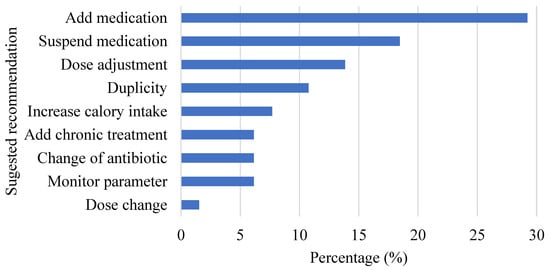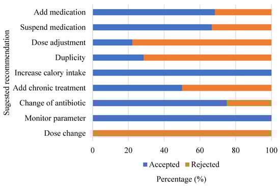 Regarding the interventions, a percentage of acceptance of 60.0% was obtained, which is consistent with the findings obtained in another study, with an acceptance percentage for interventions carried out by pharmacists ranging between 39.0% and 100.0% [25]. Recommendations with the highest percentage of acceptance were an increase in calorie intake (100%), monitorization of parameters (100%), and change of antibiotic (75%).