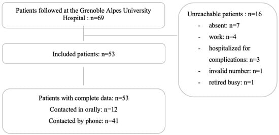 Among the 69 lung transplant patients followed at the Grenoble Alpes University Hospital, 53 were included in this analysis (Figure 1). The response rate was 100%. The mean age was 51-years-old (range: 19–72), and 40% were women (Table 1). The average time after transplantation was 3.5 years (range: 2 months to 15 years). Immunosuppressive therapies included tacrolimus (98%), corticosteroids (98%), mycophenolate mofetil (85%), everolimus (45%), and azathioprine (7%). Regarding ICT accessibility, 94% of patients had a mobile phone, 70% had a subscription with free and unlimited SMS, and 87% had internet access at home. Patients who were comfortable with SMS or internet and emails were significantly younger than those who self-reported difficulties with these ICTs (median years (Q1; Q3): 52 (37; 63)- vs. 63 (62; 66)-years-old, p = 0.01, and 52 (36; 62)- vs. 63 (55; 66)-years-old, p = 0.01, respectively).