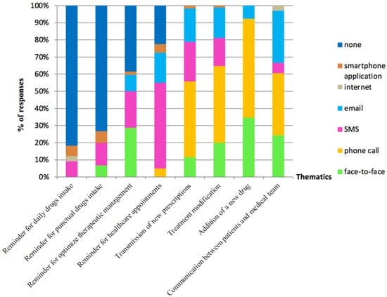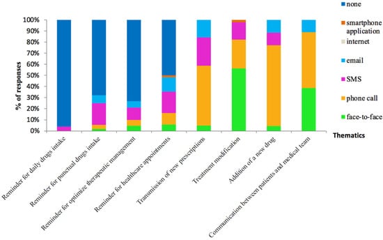 Surprisingly, our study highlights that 96% of patients and 90% of healthcare professionals would not like any reminder for daily drug intake, including immunosuppressive therapies. This result can probably be explained by the fact that patients benefit from therapeutic education, allowing them to identify the most appropriate method for their lifestyle to avoid forgetting medication and to respect the time of taking it (e.g., alarm on their mobile phone). Emails are a common method of communication, and their use in health services is increasing []. Mobile phones, including SMS, used as a support or as a reminder, have become an important tool for communication in health, and its applications are likely to increase over the years []; its usefulness has been proven in several chronic diseases. A significant reduction of graft rejection was shown with SMS reminders for taking immunosuppressive drugs delivered to pediatric recipients of liver transplants (or caregivers) []. An improvement in adherence by sending SMS reminders for taking daily treatments was highlighted in other diseases, such as asthma and human immunodeficiency virus infection [,]. Nevertheless, implementing ICTs in patients’ management may be more likely to be successful in some conditions. Indeed, 34% of our patients would appreciate reminders for taking punctual medications (such as pyrimethamine sulfadoxine or vitamin D), mainly by SMS or emails. This difference between daily and punctual drug intake is probably due to the difficulty of adherence in the latter case [,,,].