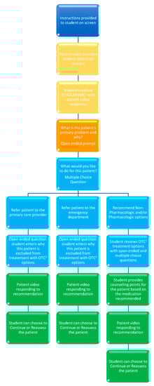 Activities incorporating standardized patients, role play, and case studies have been used to teach and/or evaluate clinical reasoning for health sciences students [1]. Human patient simulation training provides students with the opportunity to practice their skills in a high-stress, low-risk environment. This allows the educator to bridge the gap between classroom coursework and “real-life” experiences without compromising patient safety [1,2,3,4]. However, standardized patients can be expensive and difficult to fund [5]. Case studies and role-play learning have been used to engage students to apply the knowledge and skills gained in therapeutic courses to complex clinical cases [6,7]. Through small group discussions, active learning becomes an effective teaching and learning method that requires higher-order thinking skills [8]. Although role play within student groups and case studies is low cost, comprehension is dependent on the facilitator, student, or student groups, which can make it difficult to assess clinical reasoning. In the University of Arizona R. Ken Coit College of Pharmacy (RKCCOP) Doctor of Pharmacy program, the self-care therapeutics course is taught to first-year students in their first semester. Historically, this course has utilized a flipped classroom model by having students engage in patient case activities to reinforce reading content learned from the book before each class. Case studies and role-play activities were provided to the students to practice applying the content to a “real-life” patient. In 2018, students were given an Objective Structured Clinical Examination (OSCE) to assess their knowledge in which the majority of students and facilitators agreed that the OSCE provided a true measure of essential clinical skills required to assess and provide self-care to patients [9].
