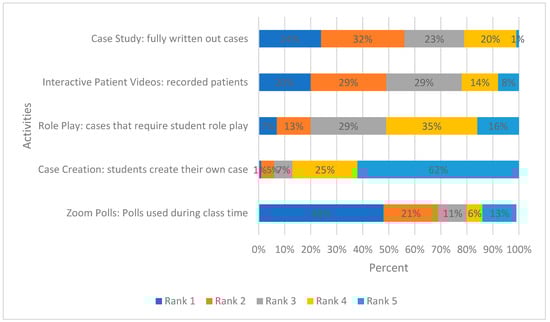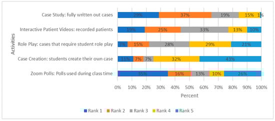 When asked to rank the activities they thought were most effective for their learning and ability to recall information, 35% ranked ‘Zoom® polls: polls used during class time’ first, 29% ranked ‘case study: fully written out cases’ first, and 19% ranked the interactive patient videos first. Few students ranked ‘case creation: students create their own case’ and ‘role-play activities: cases that require student role play’ first (11% and 7%, respectively, Figure 3).