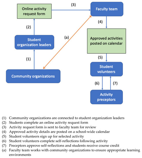 The System was built on an existing framework designed to approve student activities within the SSPPS curriculum. Following guidance from the Accreditation Council for Pharmacy Education (ACPE) Accreditation Standards, the SSPPS PharmD curriculum requires that student pharmacists complete Introductory Pharmacy Practice Experiences (IPPEs) during the Pre-Advanced Pharmacy Practice Experience (Pre-APPE) curriculum. This includes at least 50 h of patient care related community service and/or outreach activities (e.g., vaccination clinics). In addition, students are required to participate in activities within the Co-Curricular (CC) course, a one-unit mandatory course each year that aims to supplement the curriculum with a focus on selected educational domains. Most activities are planned by student organizations or individual students and overseen by a faculty team responsible for ensuring all activities meet intended learning objectives under the educational domain(s). For any new CC or IPPE activity, students complete a mandatory, online request form with information about the activity including location, date, proposed learning objectives, name(s) of pharmacist preceptor(s), type of training requirements, and additional legal and clinical requirements if the activity involves direct patient care. The online request form was created using a third-party survey tool and maintained by the faculty team. All students have access to the request form via a hyperlink that is posted within course materials for both IPPE and CC courses. The faculty team provides oversight for how students can safely and efficiently sponsor their activity and is responsible for final activity approval. Approved activities are shared on a school-wide calendar, where students may sign up to participate. Students receive IPPE and/or CC course credit by participating in an activity and completing a self-reflection that requires review and approval by the activity preceptor(s). A visual schematic of this process is shown in Figure 1.
