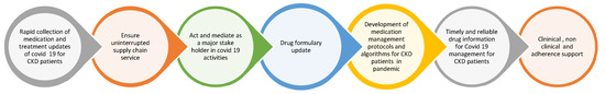 Patients with co-morbidities are more likely to contract the COVID-19 virus and have worse outcomes. In particular, CKD patients with additional underlying medical conditions are at a significantly higher risk. Based on their risk assessment, it is therefore important to minimize their visits to healthcare facilities to avoid the transmission of the virus. In this situation, the home delivery of medication by pharmacists brings with it commendable advantages. In compliance with the international COVID-19 recommendations for pharmacists and the pharmacy workforce, as well as country-specific COVID-19 guidelines, many pharmacies around the world provide daily home deliveries of drugs, essential supplies, and dialysis consumables [57,58].