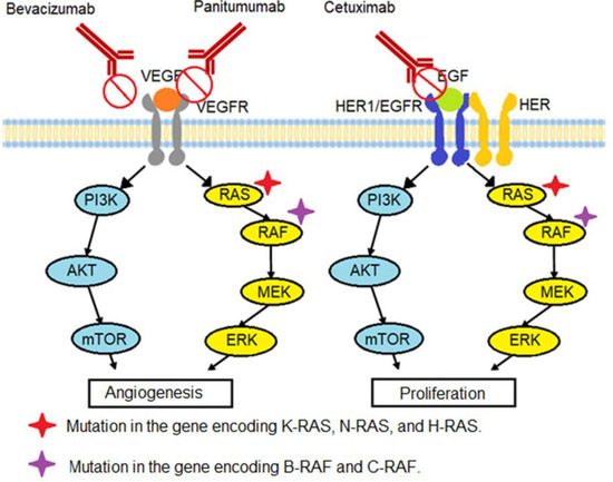 As with the RAS mutation, an intrinsic resistance to drugs causes inhibition higher up the pathway, which is the case for the anti-EGFR monoclonal antibodies used in colon cancer treatments such as cetuximab, panitumumab, and bevacizumab. Thus, patients with mutations on C-RAF or B-RAF show little or no clinical response to these drugs, with no significant differences in their survival when chemotherapy is used alone or in combination with an anti-EGFR antibody. In conclusion, survival substantially improves only when patients do not have a B-RAF or C-RAF mutation, that is, when they are wild-type [70,71,72,73,74,75,76].