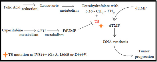 TS is a key enzyme for the 5-FU mechanism of action because it carries a complex formation with fluorodeoxyuridylate (FdUMP) and 5,10-methylenetetrahydrofolate that do not allow the TS to promote the thymidylate (dTMP) formation from uridylate (dUMP). In patients with mutations in the TS gene (TYMS), there are some polymorphisms on TYMS that modulate TS expression and consequently the response of 5-FU against tumoral DNA synthesis, and its toxicity is variable [79,80]. Figure 2 shows the mechanism below. This mutation can be associated with a mutation in an adjacent gene, ENOSF1, that can explain one of the toxicity differences between different 5-FU patient users [81,82].