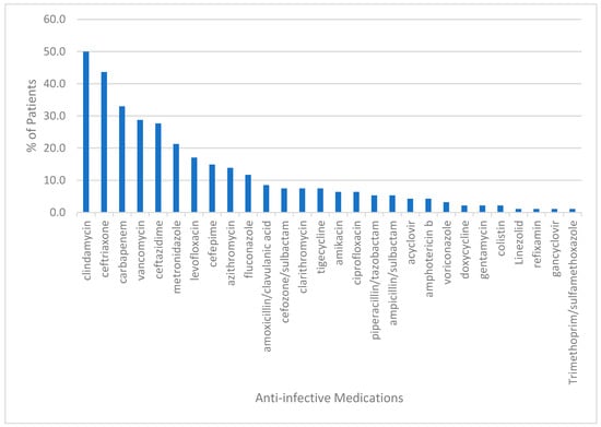 The top three most prescribed medication categories (% of total ICU prescriptions) belonged to the following therapeutic categories: (1) anti-infective agents (23.9%); (2) electrolyte, caloric and water balance agents (14.6%); and (3) blood formation, coagulation and thrombosis (11.3%). The CNS agents included drugs such as paracetamol, midazolam, phenytoin and piracetam. The miscellaneous category contained mostly the antigout agent, allopurinol. Medications belonging to the anti-infective agents were by far the most utilized at the ICU, with clindamycin, ceftriaxone and carbapenem antibiotics accounting for the top antibiotics received by patients (Figure 2).