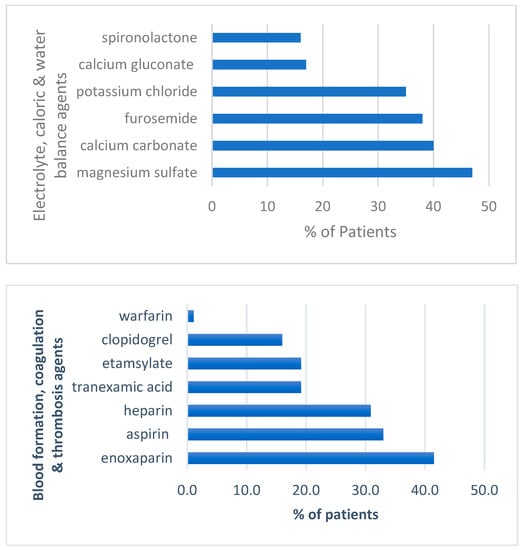 Magnesium sulfate had the highest number of prescriptions in that class of agents as it was used as a bronchodilator in patients with chest infections to relax bronchial muscles and expand the airways allowing more airflow in and out of the lungs [7,8,9]. The large number of prescriptions for calcium carbonate reflected the need to treat hyperphosphatemia and normalize phosphate concentrations in patients with CKD which constituted most ICU patients. The third highest number of prescriptions in this class was for furosemide which is the only intravenous diuretic in the ICU formulary. For the blood formation, coagulation and thrombosis category, enoxaparin was the most prescribed anticoagulant and aspirin was the most prescribed antiplatelet (Figure 3). Enoxaparin was the most used medication for DVT prophylaxis. The 25 most frequently prescribed medications are represented in Table 2.