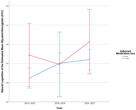 Results from mixed repeated measures ANOVA comparing the glycated hemoglobin (A1C) of individuals in the control cohort versus patients with adjuvant medication use between 2010 and 2017. Error bars reflect 95% confidence interval. Outliers omitted. Figure illustrates changes in A1C among patients with and without adjuvant medication use over time.