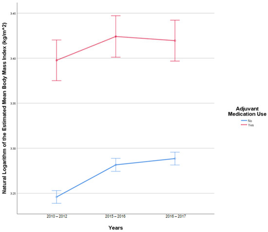 Results from mixed repeated measures ANOVA comparing the body mass index (BMI) of individuals in the control cohort versus patients with adjuvant medication use between 2010 and 2017. Error bars reflect 95% confidence interval. Outliers omitted. Figure illustrates changes in BMI among patients with and without adjuvant medication use over time.