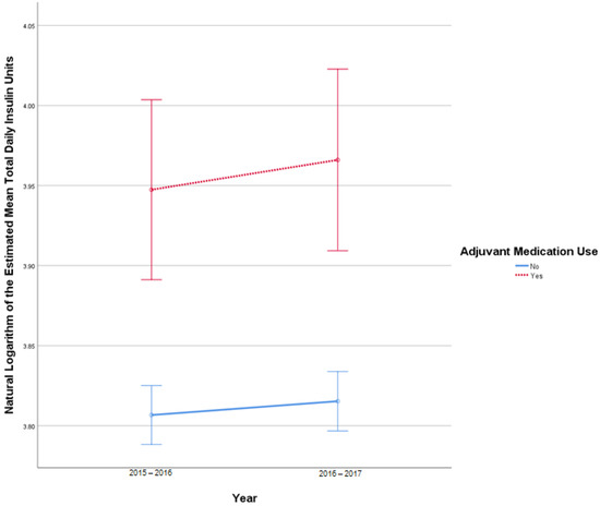 Results from mixed repeated measures ANOVA comparing the total daily insulin units (TDI) of individuals in the control cohort versus patients with adjuvant medication use between 2010 and 2017. Error bars reflect 95% confidence interval. Outliers omitted. Figure illustrates changes in TDI among patients with and without adjuvant medication use over time.