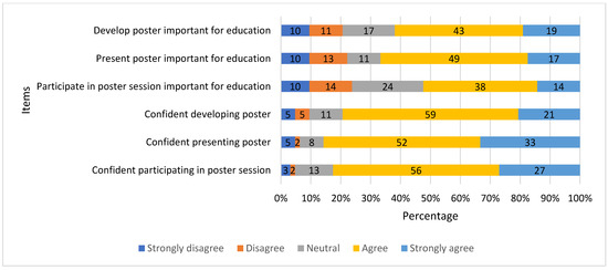 The median agreement score was four out of five for items addressing students’ perceived importance of (1) developing, (2) presenting, and (3) participating in a research poster session. Additionally, the medium agreement score was four out of five for items addressing student pharmacists’ confidence in their ability to (4) develop, (5) present, and (6) participate in a research poster session. The interquartile range was 1 for all items except confidence in ability to develop a research poster, which was 0. The percentage of students who responded to each level of agreement for each item are shown in Figure 1.
