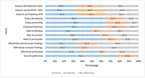 Student pharmacists’ preferences for a virtual versus in-person research poster session. Figure legend: Acquire development skills: I would acquire more poster development skills if the research poster session is. Acquire presentation skills: I would acquire more poster presentation skills if the research poster session is. Acquire participating skills: I would acquire more skills participating in the poster session if the research poster session is. Enjoy developing: I would most enjoy developing a research poster if the research poster session is. Enjoy presenting: I would most enjoy presenting a research poster if the research poster session is. Enjoy participating: I would most enjoy participating in a research poster session if the research poster session is. Able to develop: I would be most able to develop a research poster if the research poster session is. Able to present: I would be most able present a research poster if the research poster session is. Able to participate: I would be most able to participate in a research poster session if the research poster session is. Effectively communicate findings: The most effective way to communicate findings from a research project is. Effectively evaluate findings: The most effective way to critically evaluate findings from a research project is. Effectively participate: The most effective way to help ensure everyone has the opportunity to participate in the research project poster session is. Overall preference: Overall, if I had to choose one approach for developing a research poster, presenting a research poster, and participating in a research poster session, I would choose.
