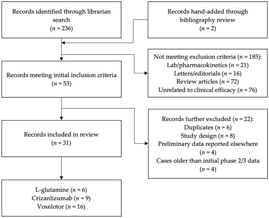 A medical librarian (M.B.) performed a comprehensive literature search on 19 January 2022, of PubMed, Embase, Cochrane Library, CINAHL, Scopus, and Web of Science. The keywords “sickle cell anemia” AND “voxelotor” OR “crizanlizumab” OR “glutamine” were used, with a date range of 2017 to 2022, corresponding to the post-FDA-approval dates. This search returned 236 citations. Two citations were added through citation analysis. Following the initial collection, citations were evaluated based on the inclusion and exclusion criteria. Figure 1 depicts the flow of studies through the review.