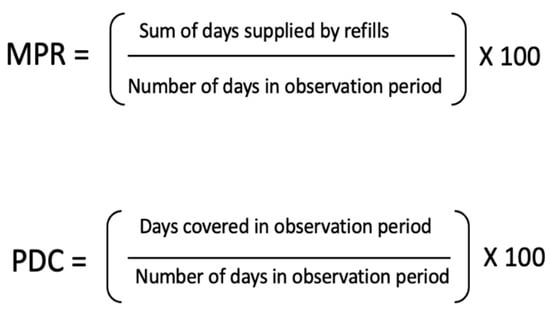 There are a range of methods used to measure medication adherence, such as measuring drug metabolites, pill counts, pharmacy dispensing records, patient reports and devices that record a pill container being opened. The most common method is to use pharmacy records in large observational cohort studies. This is because analysing dispensing or prescribing records is relatively cheap, non-invasive to participants, has less participations bias, and easy to conduct on a large-scale compared to other measures. A pharmacy records the days’ worth of a medicine dispensed over a period of time which can be used to calculate when the patient has medicine available. Medication possession ratio (MPR) and proportion of days covered (PDC) are the calculations most frequently used (Figure 1). A subtle difference is that MPR can overestimate medication adherence if individuals collect their refills early. This is then reported as the pharmacies mean PDC or as a proportion of their patients with a PDC greater than 80% [].
