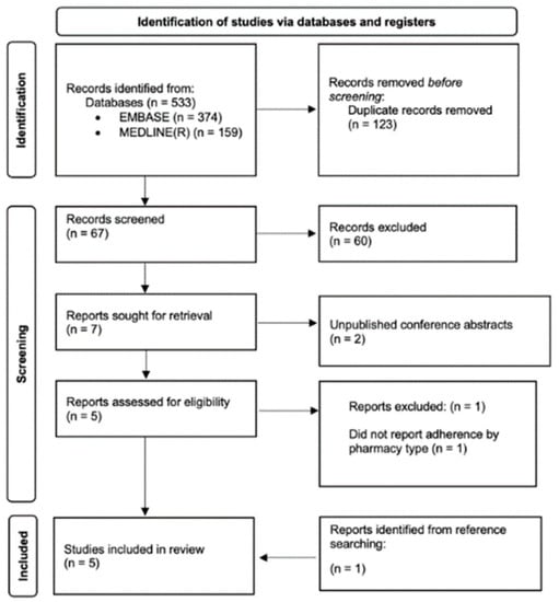The following search was used (“patient compliance” OR “medic* adherence” OR “medic* persistence” OR “medic* possession” OR “medic* compliance”) AND (“community pharmac*”, “dispensing channel”, “retail pharmac*”) AND (“chain”, “discount”, “mass retail*”).