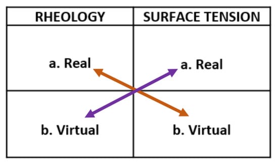 All students in the first year Introduction to Pharmacy course participated in a combination of a VL accessed in the laboratory and a RL. The sequence of laboratory sessions occurred over a two-week period, with students completing one session each week. They were randomly assigned to participate in a real Rheology session and a virtual Surface Tension session (shown by the orange arrows) or a real Surface Tension session and a virtual Rheology session (shown by the purple arrows) in Figure 1.