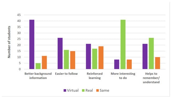 After completing both a VL and a RL, students were also asked to indicate their preferred laboratories for different learning experiences from the choices ‘Virtual’, ‘Real’ or ‘Same’ using a 5-question survey. For each question, there was an open-ended response asking students to indicate the reason(s) for their choice.
