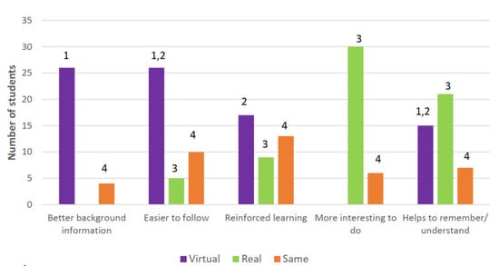 These findings are consistent with the work of others where studies have been conducted in different countries at different levels of education and in different disciplines. For example, no significant differences in student achievements between VLs and RLs were observed in physics laboratories with 90 university students in Palestine, [], or with 80 pre-service school teachers in physics laboratories in Turkey [], or in chemistry laboratories with 45 high school students in Germany [].