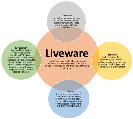 - Croft, H.; Nesbitt, K.; Rasiah, R.; Levett-Jones, T.; Croft, C.G. Safe Dispensing in Community Pharmacies: Applying the Software, Hardware, Environment and Liveware (SHELL) model. Pharm. J. 2017, 9. Available online: https://pharmaceutical-journal-com.ezproxy.auckland.ac.nz/article/research/safe-dispensing-in-community-pharmacies-applying-the-software-hardware-environment-and-liveware-S.H.E.L.L-model (accessed on 8 September 2021).