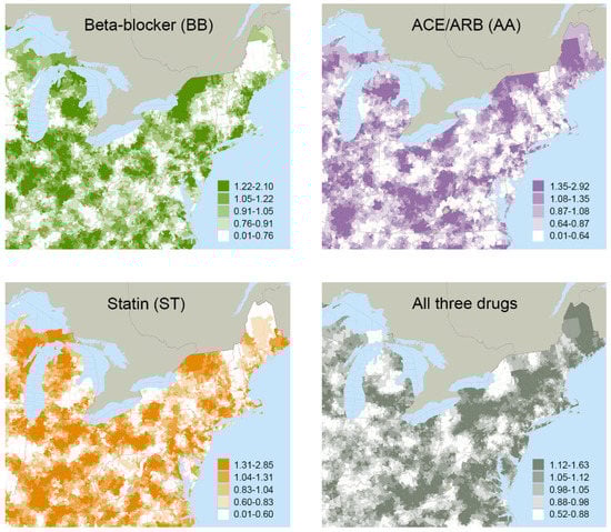 The mean treatment rates for local areas grouped by ATR quintiles are reported in Table 2. Variations in treatment rates were observed across quintiles, as well as geographically, for the various drug combinations (Figure 1). For example, 35.7% of the study cohort had guideline-recommended treatment (BB+AA+ST) overall, but this varied from a mean of 27.7% in the local areas grouped in the lowest quintile to 42.8% in the local areas grouped in the highest quintile. First-stage F-statistics ranged from 29.0 to 34.5 across all drug combinations, satisfying traditional thresholds (>10) to support that the instruments were not weak [104,105].