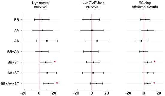 Abbreviations: IV = instrumental variables; CVE = cardiovascular event; β coef = beta coefficient (parameter estimate); SE = robust standard error; BB = beta-blocker; AA = ACE/ARB; ST = statin; CVE = cardiovascular event. * Guideline-recommended combination therapy (BB+AA+ST) was set as the reference group. Parameter estimates reflect absolute effects, and are measured in percentage points. Mean (full sample) outcomes were 84.3% for overall survival, 75.4% for CVE-free survival, and 5.4% for adverse events. Covariates included in the models are listed in File S1.