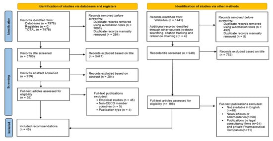 The Google search produced 1441 potentially relevant publications. Results from each of the 37 searches were manually imported into Excel for 35/37 countries (two searches produced only 34 and seven results). After deduplication, title and full-text screening, 46 were considered eligible for inclusion (Figure 1).