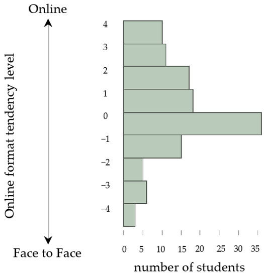 The results of the questionnaire (Q1 and Q2) are shown in Table 2. Online format tendency levels (Q2 response numbers minus Q1 response numbers) are shown in Figure 1. The average of the online format tendency level of all students was 0.58 ± 1.92. There were 29 students in the face-to-face format-oriented group (24.0%), 36 students in the neither group (29.8%), and 56 students in the online format-oriented group (46.3%).