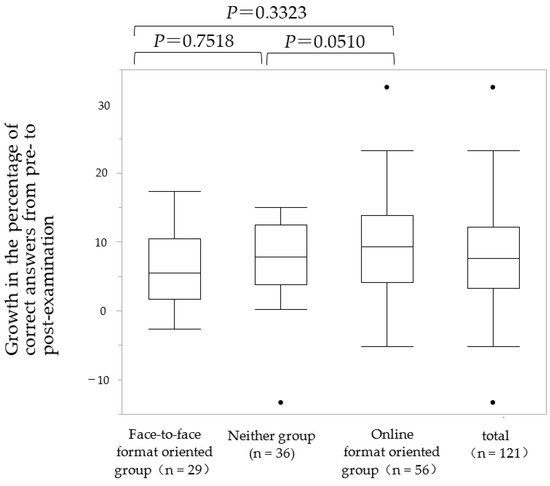 The percentage of growth in academic performance between the pre- and the post-course examinations for each group is shown in Figure 2. The mean growth of the face-to-face format-oriented group was 7.24 ± 1.20, and that of the online format-oriented group was 9.33 ± 0.86. The p value between groups was 0.3323, and did not indicate a significant difference. The growth in the examination results for the neither group was 6.08 ± 1.07. When comparing the performance of the neither group and the online format-oriented group in the examination, the growth in the examination was higher for the online format-oriented group, and the p value was 0.0510.