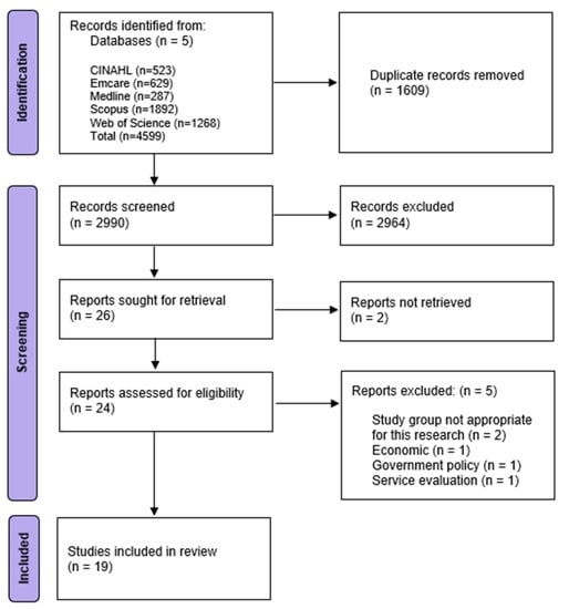 Figure 1 illustrates the PRISMA (Preferred Reporting Items for Systematic Reviews and Meta-Analyses) 2020 flow diagram for scoping review strategy []. The original database searches produced 4599 records. A total of 1609 duplicates were removed, leaving 2990 studies to screen. These 2990 studies were screened based on the title and contents of the abstract, with 2964 excluded based on the exclusion criteria. The full text of the 26 remaining studies was sought for retrieval, with 2 records not retrieved due to the full text not being available in the English language. A review of the full text of the 24 remaining studies was completed, with 19 remaining studies suitable for this review (Figure 1). The studies published ranged in date from 2009 to 2021. While many of the studies were published in the United States (11), studies were also based in Australia (3), Canada (2), Indonesia (1), Germany (1), and Ghana (1) [,,,,,,,,,,,,,,,,,,].