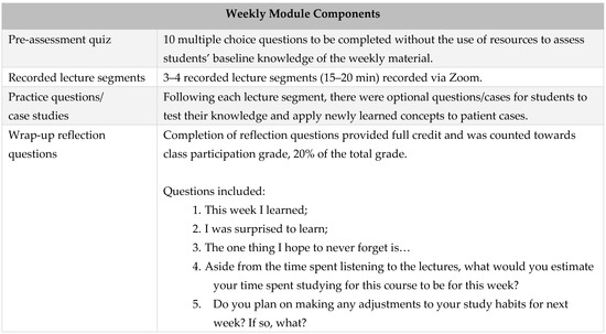 This study used a retrospective observational study design examining data from a required 2 unit endocrine integrated science course in the PharmD curriculum. This study took place during the diabetes module over a 6 week timeframe. The course used a self-paced, flexible modular design delivered via an online learning management system, Canvas. Each weekly module consisted of four major components: pre-assessment quiz, recorded lecture segments, practice questions/cases, and a wrap-up reflection. (Figure 1)