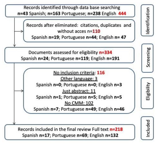 The literature review process is illustrated in Figure 1. A total of 444 documents were identified in the two searches of Google Scholar, resulting in 43 Spanish, 163 Portuguese and 238 English documents. Duplicates (n = 72), citations (n = 28) and documents that could not be accessed (n = 15) were eliminated. Of the remaining 334 publications, 218 were retained for further analysis.