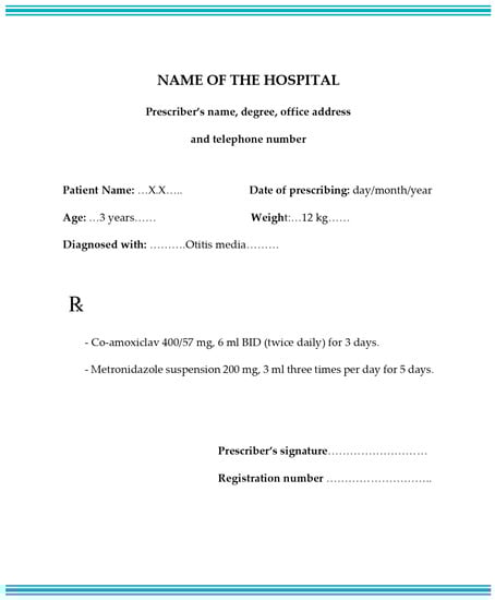 Antibiotic resistance is the utmost danger that threatens public health, especially children. According to World Health Organization (WHO) data, there are 700,000 deaths across all ages due to infections caused by multidrug-resistant bacteria. One of the causes of antibiotic resistance is the use of antibiotics for wrong diagnoses and indications []. In this study, metronidazole suspension was prescribed for a child diagnosed with otitis media. There is no rational reason for prescribing it in this case, so it is considered an inappropriate indication for diagnosis. Inappropriate indication for diagnosis is when a drug is prescribed to a patient that is not intended to treat the symptoms of the diagnosed disease and is not consistent with the drug indication [].