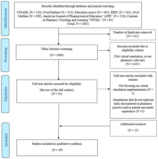 A systematic search was conducted using five major literature databases: Ovid Medline, CINAHL, ERIC, Education Source, and Ovid Embase, from January 2000 to August 2021. The bibliographies of the included studies were searched manually for the identification of any additional resources. The authors also explored the websites of the commercially available simulators which were identified (MyDispense, DecisionSim, GIMMICS, Pharmacy Simulator, SimPharm, Virtual Interactive Case System (VICs), EHR GO). In addition, the authors searched two Journals specialising in pharmacy education (American Journal of Pharmaceutical Education “AJPE” and Currents in Pharmacy Teaching and Learning “CPT&L”) as an extra measure to ensure the search was comprehensive. The search terms used in this study were “pharmacy education”; “teaching method”; “computer-based simulation”; “online simulation”; “virtual simulation”; and “virtual patient”.
