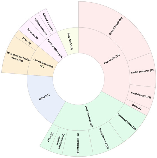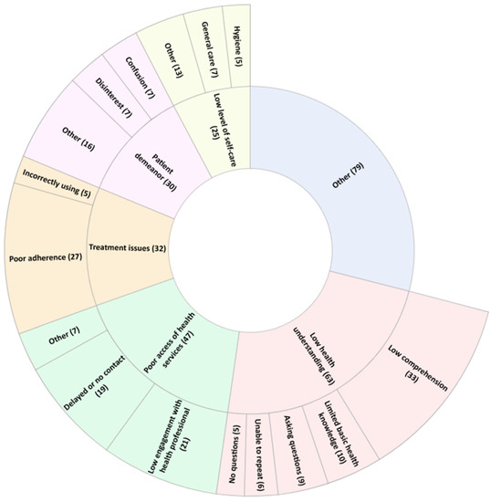 Student-described potential consequences of inadequate patient health literacy. The five most frequently reported categories, and ‘Other’, are displayed. The inner wheel lists the category; the outer wheel lists the codes within that category. The number of times a response was assigned to a given category or code is reported in brackets. The category ‘Other’ denotes all responses which did not fit within the top five categories. The code ‘Other’ denotes all codes which contain less than 2% (n = 4) of total responses for the question.