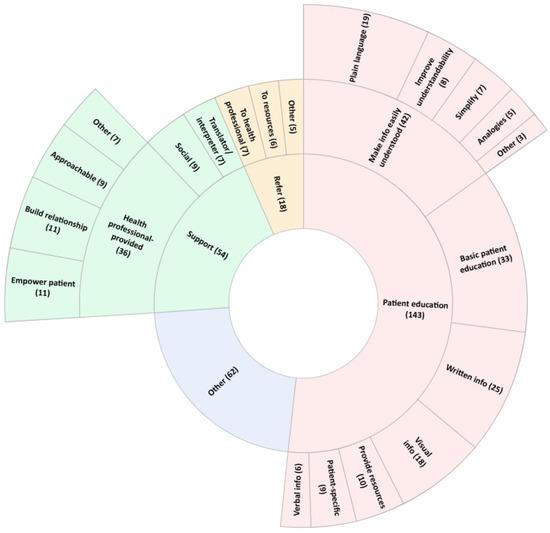 Student-described actions that a health or social care professional can take to help a patient with inadequate health literacy. The three most frequently reported categories, and ‘Other’, are displayed. The inner wheel lists the category; the middle wheel lists the codes within that category and the outer wheel lists sub-codes from the three most frequently reported codes, where applicable. The number of times a response was assigned to a given category, code or sub-code is reported in brackets. The category ‘Other’ denotes all responses which did not fit within the top five categories. The code and sub-code ‘Other’ denote all codes and sub-codes which contain less than 2% (n = 5) of total responses for the question.