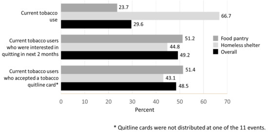 Current tobacco use, interest in quitting in the next two months, and tobacco quitline card acceptance (food pantry, homeless shelter, and overall; %).