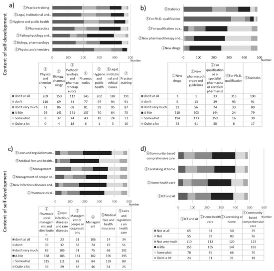 Professional education requires self-development, and these competencies must be continued in pharmacists’ careers. Regarding the factors of self-development, our study revealed that self-development requires not only recognition but also the ability to act, behave correctly and perceive the needs of society. In particular, the factor of 4: pharmacists’ behaviour as students might be related to “in UCSF, disciplinary action taken against physicians by the Medical Board of California was associated with prior unprofessional behaviour when the physicians were students [14]” or “disciplinary action among practising physicians by medical boards was strongly associated with unprofessional behaviour in medical school [15]”. Moreover, regarding Q11, “How much time do you spend on continuing self-development related to pharmacist work during a week?”, the largest number of respondents answered “1–3 h”, which is by no means sufficient time for self-learning. Naturally, if they do not set goals, they will not know how many hours you need to study to reach their goals [29,30]. Then, regarding Q15, “Tools for continuing self-development”, respondents answered “at home using books purchased by themselves and web searches”, “study meeting of medical associations such as the Japanese Society of Hospital Pharmacists or Japan Pharmaceutical Association” and pharmaceutical companies’ (wholesalers) study meetings. Therefore, various places, including pharmacy universities, must provide learning tools or programs to develop pharmacists’ or students’ competencies. In addition, each university will be required to establish a system to monitor the lifelong learning status of graduates in order to assure the quality of pharmacists (including goal setting).