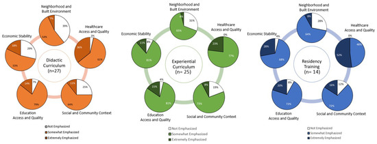 Along the pharmacy training continuum, emphasis on the SDOH increased from didactic to experiential to residency. Across all five SDOH domains, respondents indicated a greater emphasis on SDOH in experiential training vs. didactic education. For example, reported emphasis on “Economic Stability” was more emphasized in the experiential setting (92%) than in didactic education (71%). The “Neighborhood and Built Environment” domain was the least emphasized of the five domains across all training levels. A full breakdown of the reported curricular emphasis of all five SDOH domains across the different levels of training can be seen in Figure 1.