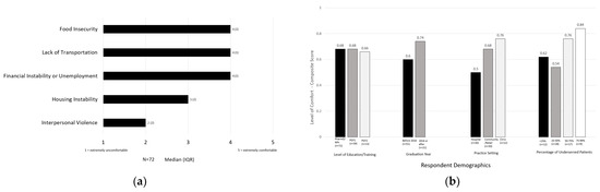 Investigators have reported descriptive statistics. Due to the small sample size of various demographics, extensive statistical sub-analyses were not conducted; however, the survey respondent characteristics were explored. For analysis of comfort, a composite score was calculated for several respondent characteristics. The comfort composite score was calculated as such: the median comfort level on the 5-point Likert scale (for five social risk factors, one from each SDOH domain) was summed and averaged (out of 25 possible total) for analysis and comparison. On a scale of 0 to 1, a composite score of 1 would indicate extreme comfort in addressing social risk factors. Exposure and awareness results are presented in the aggregate to describe general trends and observations.