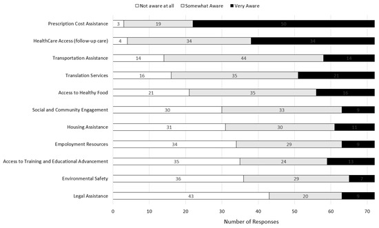 Preceptors reported the highest level of awareness of prescription cost assistance (n = 50, 69.4% “very aware”) and healthcare access. Conversely, preceptors reported the lowest awareness of resources focusing on legal assistance (n = 43, 59.7% “not aware at all”), environmental safety, training and educational advancement, and employment resources. Preceptors reported a moderate level of awareness of the other resources assessed (see Figure 3).
