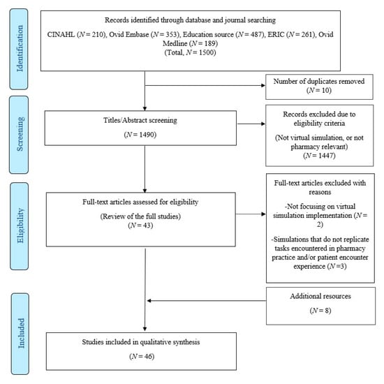 The initial search yielded 1500 studies in total. Out of these, 43 were deemed suitable for a full-text review. Post full-text analysis, an additional 5 studies were removed as they did not align with the pre-established inclusion criteria (they were either not in English or addressed different forms of simulation). However, through citation analysis, 8 more potential studies were discovered. In the end, 46 studies were selected for inclusion in the qualitative synthesis (Figure 1).