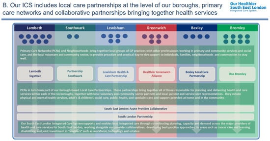 - Our Healthier South East London. SEL Integrated Care System Development Plan. 2022. Available online: https://selondonccg.nhs.uk/wp-content/uploads/2022/05/SEL-ICS-System-Development-Plan_22-March-2022.pdf (accessed on 27 June 2023).