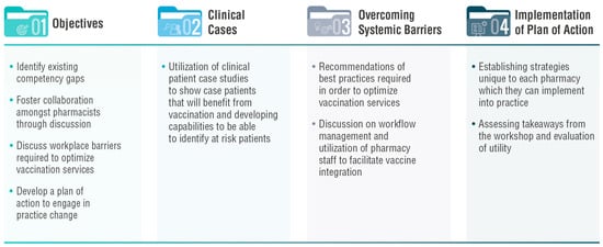 Herein, we report on the results of our most recent workshop, which sought to equip pharmacists with the skills to optimize delivery of vaccination services in their community by discussing key challenges including the identification of patients who will benefit from vaccinations, contribution of pharmacy staff, and integration of vaccination into pharmacy workflow. Pharmacists throughout the province who completed these workshops were awarded a continuing education unit (CEU) credit by the Ordre des pharmaciens du Québec (OPQ). As shown in Figure 1, the workshops had four overarching objectives: (1) identifying existing competency gaps of the pharmacists, (2) fostering peer-to-peer exchange, (3) discussing workplace barriers required to optimize immunization services (beyond COVID-19 vaccines) and (4) developing a plan of action (POA) to engage in practice change.
