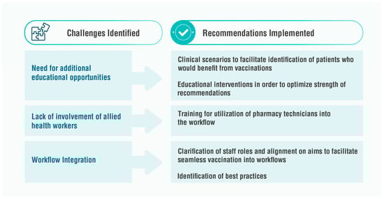 Three major challenges that were identified were (1) the need for additional educational opportunities, (2) managing allied healthcare workers (e.g., pharmacy assistants and nurses), and (3) effectively managing workflow and scheduling. Recommendations identified to tackle these challenges include development of clinical scenarios and educational interventions, better training of pharmacy assistants and other support staff and clarification of their roles, and identification of best practices from other pharmacies and pharmacists.