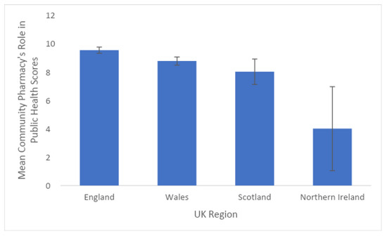 There was no effect of the UK region on Relationship, Expertise, or Privacy scores. There was an effect of nation of the UK on perceived Role in Public-Health scores (f (4) = 2.411, n = 304, p < 0.05) where individuals in England scored the highest (9.519) and Northern Ireland scored the lowest with the largest amount of standard error (4.0, SE = 2.954; see Figure 1), (NOTE: this was based on one respondent only from Northern Ireland). Pairwise comparisons with a Tukey correction indicated a significant interaction between England and Wales (mean difference = 0.766, p < 0.05) indicating a better overall perception of the community pharmacy’s role in public health in England (See Figure 1).