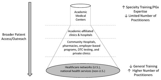 With respect to their roles in the clinical delivery of PGx testing, pharmacists have been involved or led the delivery of PGx testing in three major settings (Figure 1): (1) health systems or hospital-based pharmacist services [16,17,18,19,20,21,22,23]; (2) outpatient clinic-based consultation services or clinics [24,25,26,27,28,29,30]; and (3) community pharmacies [31,32,33,34,35,36,37,38,39]. Many PGx programs were initiated and reside in departments and divisions of academic medical centers where many leading pharmacist researchers are based (Figure 1). These centers are most likely to have the expertise and training programs required to establish a PGx testing program and support the required infrastructure. Subsequently, PGx testing may spread to academic-affiliated clinics before moving outside of academic medicine to community-based settings where larger patient populations will have access to testing.