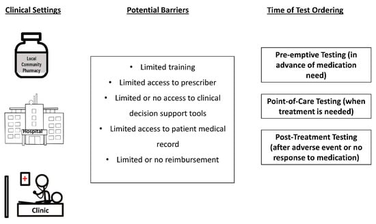 More recently, following the pandemic and pharmacists’ expanded authority regarding testing services [106], it is possible that this experience will advance a greater role for pharmacists with respect to clinical testing in general, and more specifically for PGx testing. However, while the continued expansion of pharmacy services to include testing may yield economic benefits for pharmacies and increase access to various services for patients [107,108], an expanded role beyond the traditional roles of dispensation and patient counseling (via community-based pharmacists) [109] may not be wholly supported by physicians, and factors such as pharmacists’ clinical expertise and control influence physicians’ attitudes [110,111]. However, in the community setting (or a centralized service serving multiple sites), pharmacists are not likely to have access to a patient’s full medical record or medication history, thereby limiting their ability to interpret the clinical significance of the PGx test results [43]. Community pharmacists may also not have a close working relationship with a prescribing physician, which may further impede implementation of PGx testing [89]. In contrast, in outpatient clinic settings, pharmacists may serve as members of clinical teams, and have access to both the patient’s medical record and health provider.