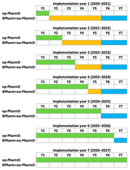 Timeline of the transition between the Bachelor of Pharmacy (BPharm, orange boxes) and two-year elective add-on PharmD programs (ao-PharmD, blue boxes) to a seven-year entry-to-practice PharmD (ep-PharmD, green boxes) curriculum.