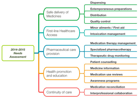 To support the provision of competent pharmacists, the International Pharmaceutical Federation (FIP) proposed a needs-based education model to guide colleges of pharmacy in developing a competency framework that would be aligned with local needs [1,2]. The model suggests that those needs of the population are to be met by relevant professional activities (or services) performed by pharmacists. Pharmacists must be competent in providing those services, and these competencies should drive the education curriculum [3]. The development of competency-based curricula, grounded in local needs, has been highlighted in the literature as one of six strategies to meet patient care and education needs [4,5]. It is also considered a means to integrate local health needs with professional priorities by moving away from more traditional education approaches [6].